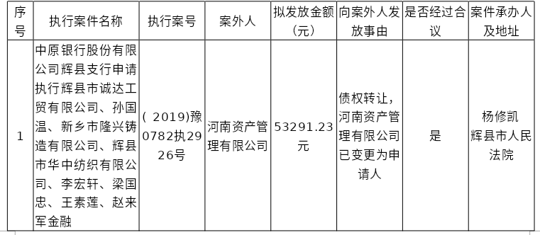 辉县市人民法院关于向案外人河南资产管理有限公司发放执行案款的公示