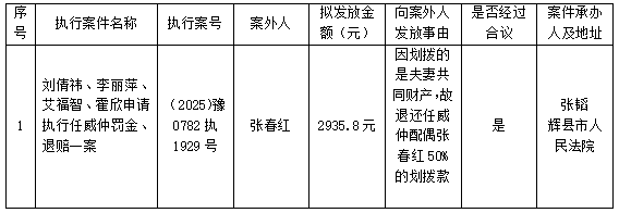 辉县市人民法院 关于向案外人张春红发放执行案款的公示