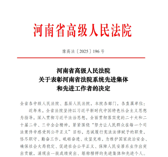 为表彰先进、激励队伍,进一步推动全省法院工作高质量发展,近日,河南省高级人民法院下发《河南省高级人民法院关于表彰河南省法院系统先进集体和先进工作者的决定》。其中,辉县市人民法院刑事审判庭获得“河南省法院系统先进集体”称号。
