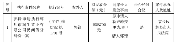 辉县市人民法院 关于向案外人郭锋发放执行案款的公示