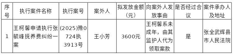 辉县市人民法院关于向案外人王小芳发放执行案款的公示