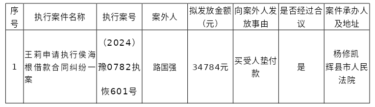 辉县市人民法院关于向案外人路国强发放执行案款的公示