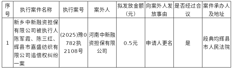 辉县市人民法院关于向案外人河南中新融资担保有限公司发放执行案款的公示
