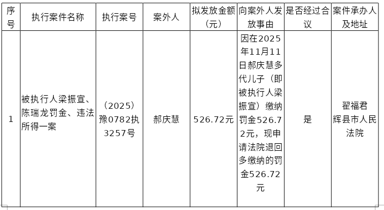 辉县市人民法院关于向案外人郝庆慧发放执行案款的公示