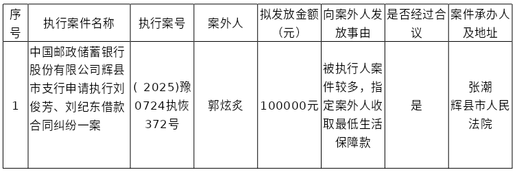 辉县市人民法院关于向案外人郭炫炙发放执行案款的公示