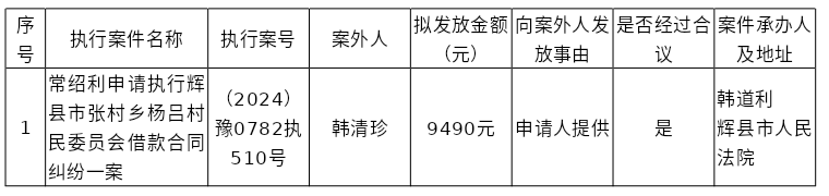 辉县市人民法院关于向案外人韩清珍发放执行案款的公示
