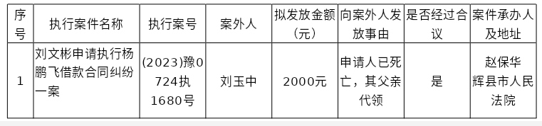 辉县市人民法院关于向案外人刘玉中发放执行案款的公示