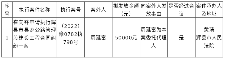 辉县市人民法院关于向案外人周延富发放执行案款的公示
