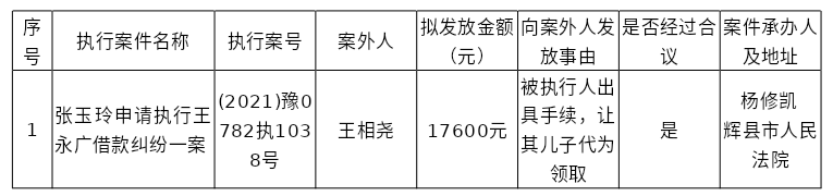 辉县市人民法院关于向案外人王相尧发放执行案款的公示