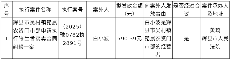 辉县市人民法院关于向案外人白小波发放执行案款的公示
