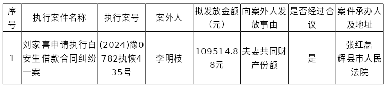 辉县市人民法院关于向案外人李明枝发放执行案款的公示