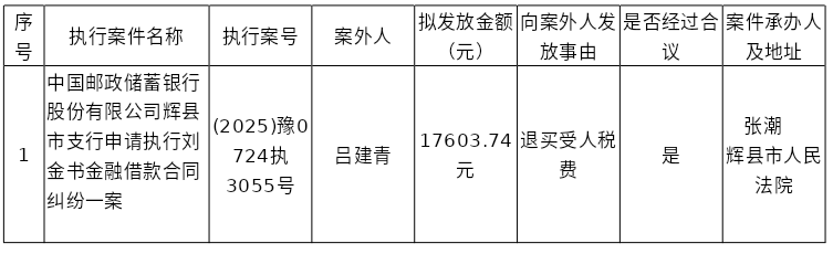 辉县市人民法院关于向案外人吕建青发放执行案款的公示