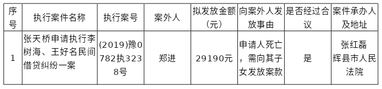 辉县市人民法院关于向案外人郑进发放执行案款的公示