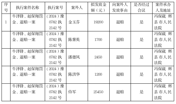 辉县市人民法院关于向案外人金玉芬、陈紫英、侍军、潘德凤、陈洪华发放执行案款的公示 发布时间:2026-01-27 08:23:13