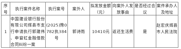 辉县市人民法院关于向案外人郭诗雨发放执行案款的公示