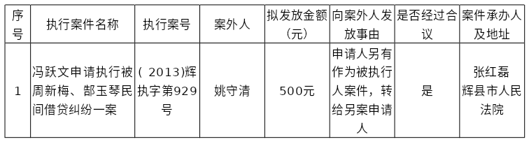 辉县市人民法院关于向案外人姚守清发放执行案款的公示