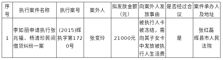 辉县市人民法院关于向案外人张变玲发放执行案款的公示