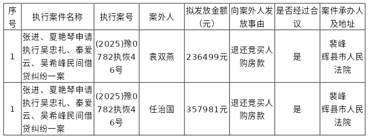 辉县市人民法院关于向案外人袁双燕、任治国发放执行案款的公示