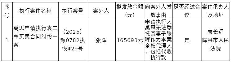 辉县市人民法院关于向案外人张晖发放执行案款的公示