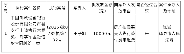 辉县市人民法院关于向案外人王子旭发放执行案款的公示
