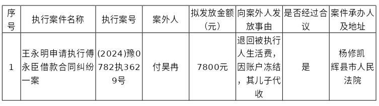 辉县市人民法院关于向案外人付昊冉发放执行案款的公示