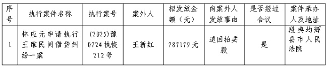 辉县市人民法院 关于向案外人王新红发放执行案款的公示