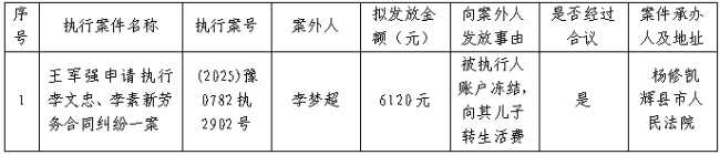 为进一步加强执行案款管理,规范执行案款发放程序,根据河南省高级人民法院《关于进一步规范执行案款管理工作的通知》等相关规定要求,现对以下执行案款发放事宜进行公示,公示期为两个自然日(2026年2月11日-2026年2月12日),案件当事人或者其他利害关系人如有异议应当在公示期内提出并提交相关证据材料,公示期满无异议的,本院将按照执行案款管理的相关规定办理发放手续。