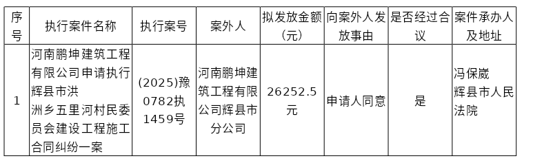 辉县市人民法院关于向案外人河南鹏坤建筑工程有限公司辉县市分公司发放执行案款的公示 发布时间:2026-02-11 07:40:52