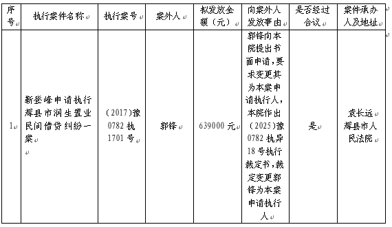 辉县市人民法院关于向案外人郭锋发放执行案款的公示
