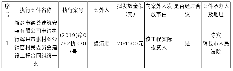 辉县市人民法院关于向案外人魏清顺发放执行案款的公示