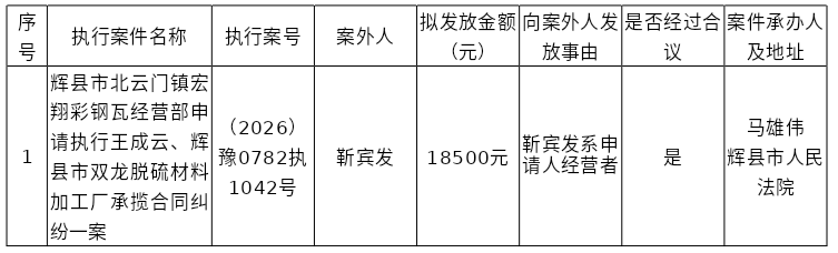 辉县市人民法院关于向案外人靳宾发发放执行案款的公示
