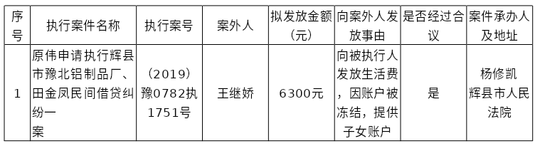 辉县市人民法院关于向案外人王继娇发放执行案款的公示