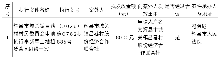 辉县市人民法院关于向案外人辉县市城关镇吕巷村股份经济合作联合社发放执行案款的公示 发布时间:2026-03-10 06:09:13