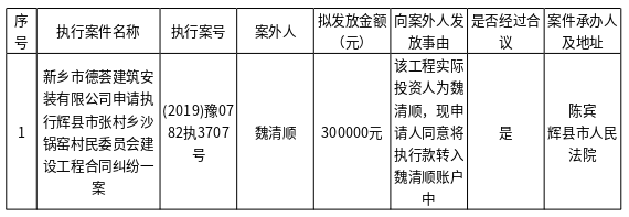辉县市人民法院关于向案外人魏清顺发放执行案款的公示