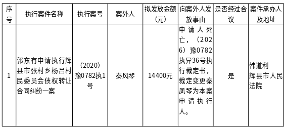 辉县市人民法院关于向案外人秦风琴发放执行案款的公示